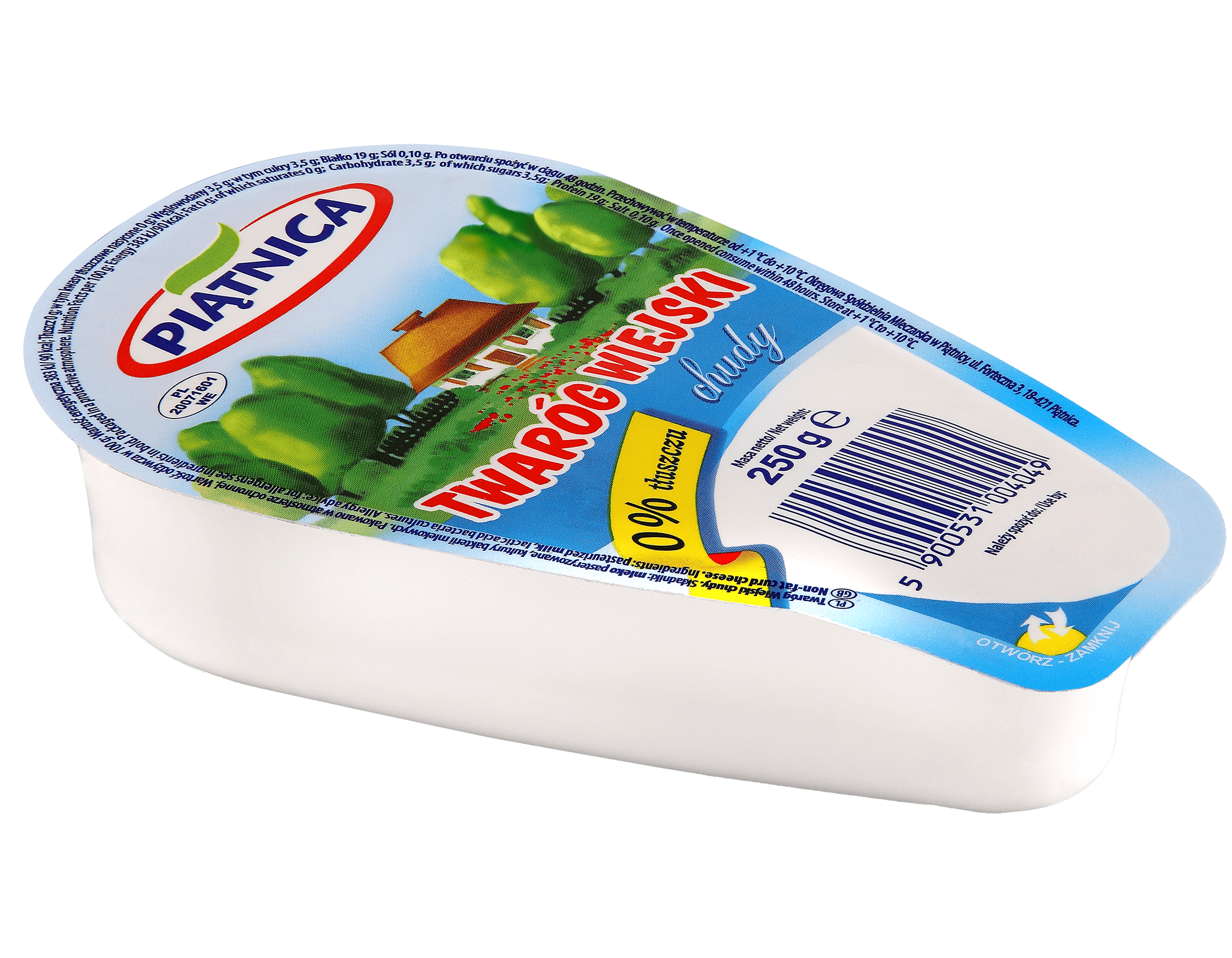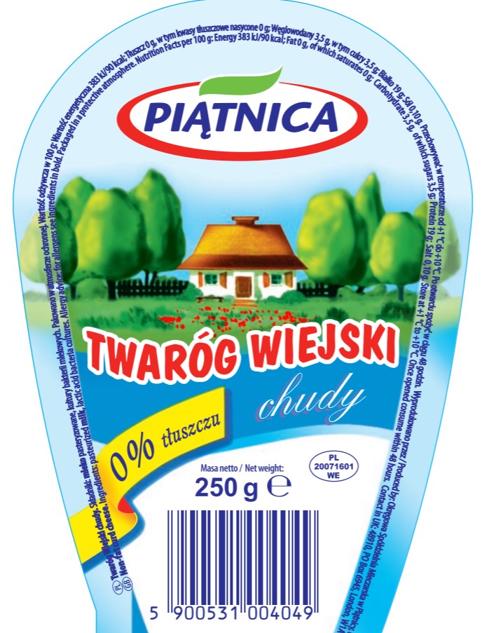 Delikatny twaróg formowany w kształcie wiejskiego klinka, o stałej wadze 250 g i cenie. Dostępny w wygodnym opakowaniu z opcją wielokrotnego otwierania i zamykania. Całkowicie – zawiera wyłącznie składniki mleka i kultury bakterii – bez konserwantów. Delikatny, odtłuszczony Twaróg Wiejski lekki, bez soli, źródło wapnia i białka jest doskonałym uzupełnieniem lekkostrawnej diety.