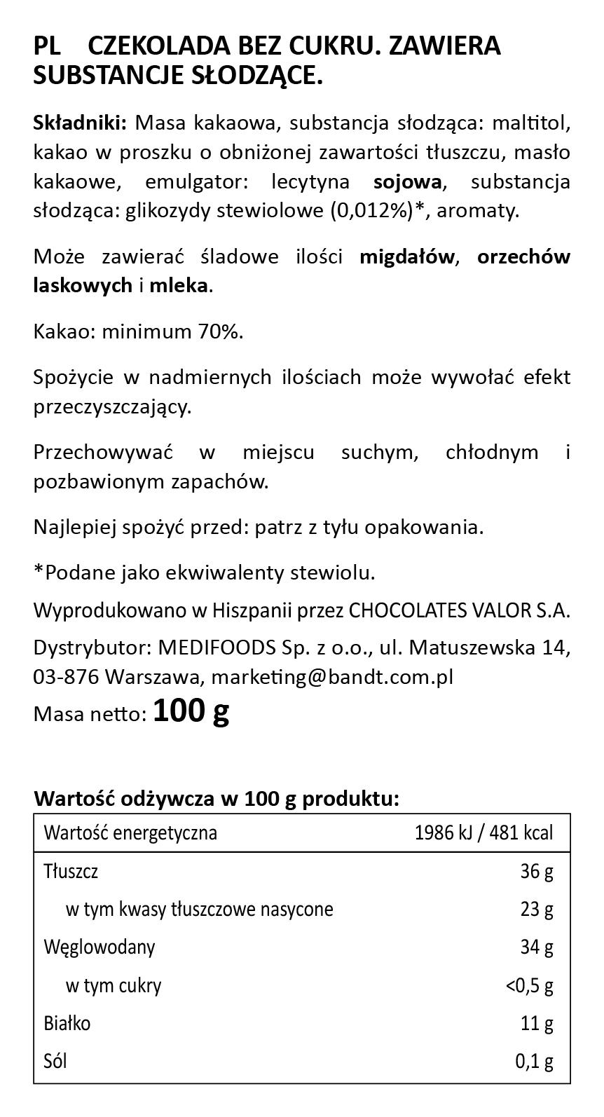 | Składniki | Masa kakaowa, substancja słodząca: maltitol, kakao w proszku o obniżonej zawartości tłuszczu, masło kakaowe, emulgator: lecytyna sojowa, substancja słodząca: glikozydy stewiolowe (0,012%)*, aromaty. kakao: minimum 70%. *podane jako ekwiwalenty stewiolu. |