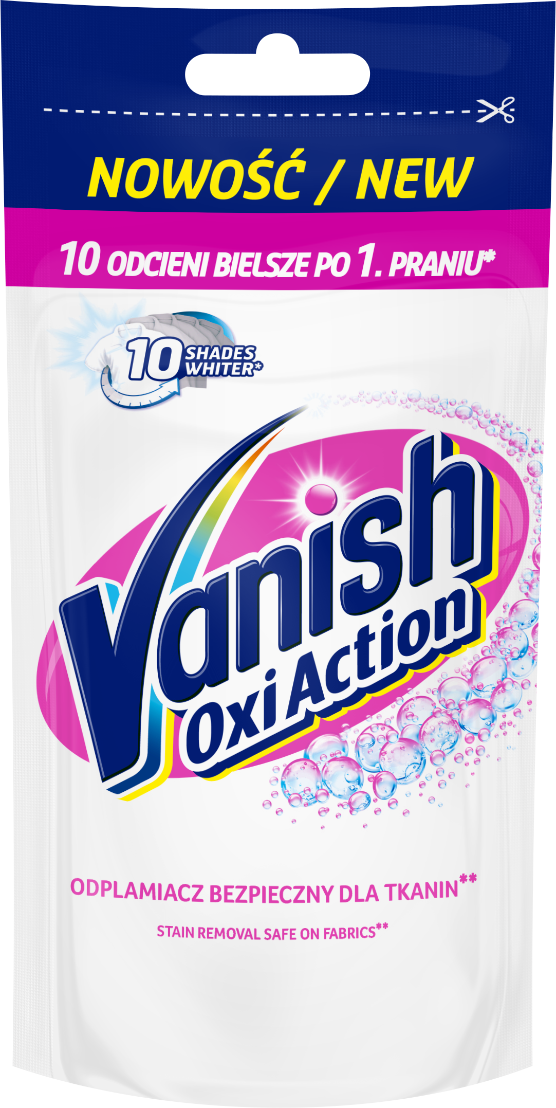 Vanish Oxi Action Krystaliczna Biel usuwa plamy i sprawia, że białe tkaniny stają się jeszcze bielsze już po pierwszym praniu!