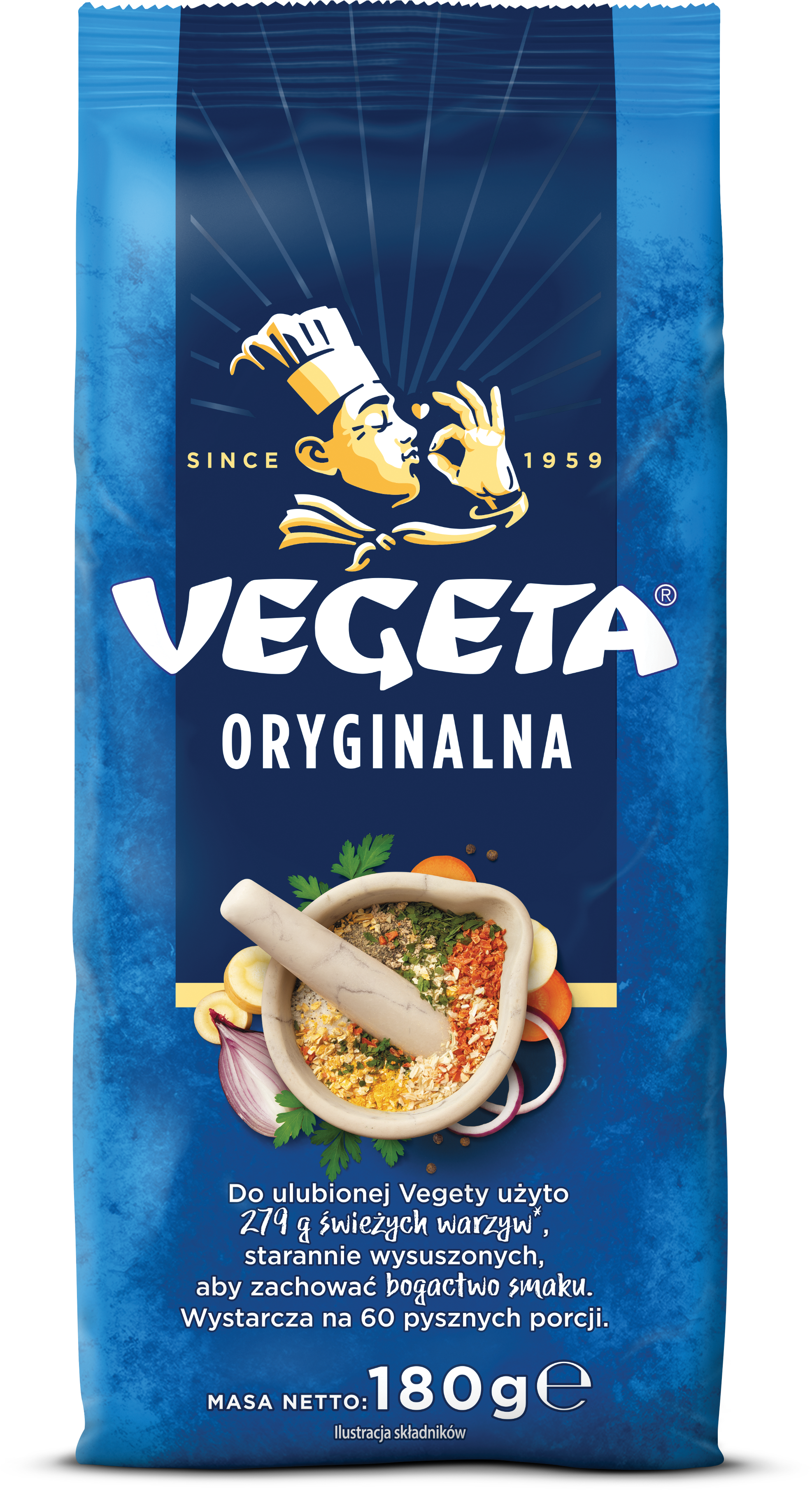 | Instrukcje dotyczące przygotowania | Na jedną porcję (250 ml) gotowanej lub duszonej potrawy (zup, sosów, ryżu, warzyw i potraw mięsnych) dodać 1 łyżeczkę (3 g) Vegety na 5 minut przed końcem gotowania. Mięso lub potrawy rybne przed pieczeniem doprawić Vegetą według uznania. |
