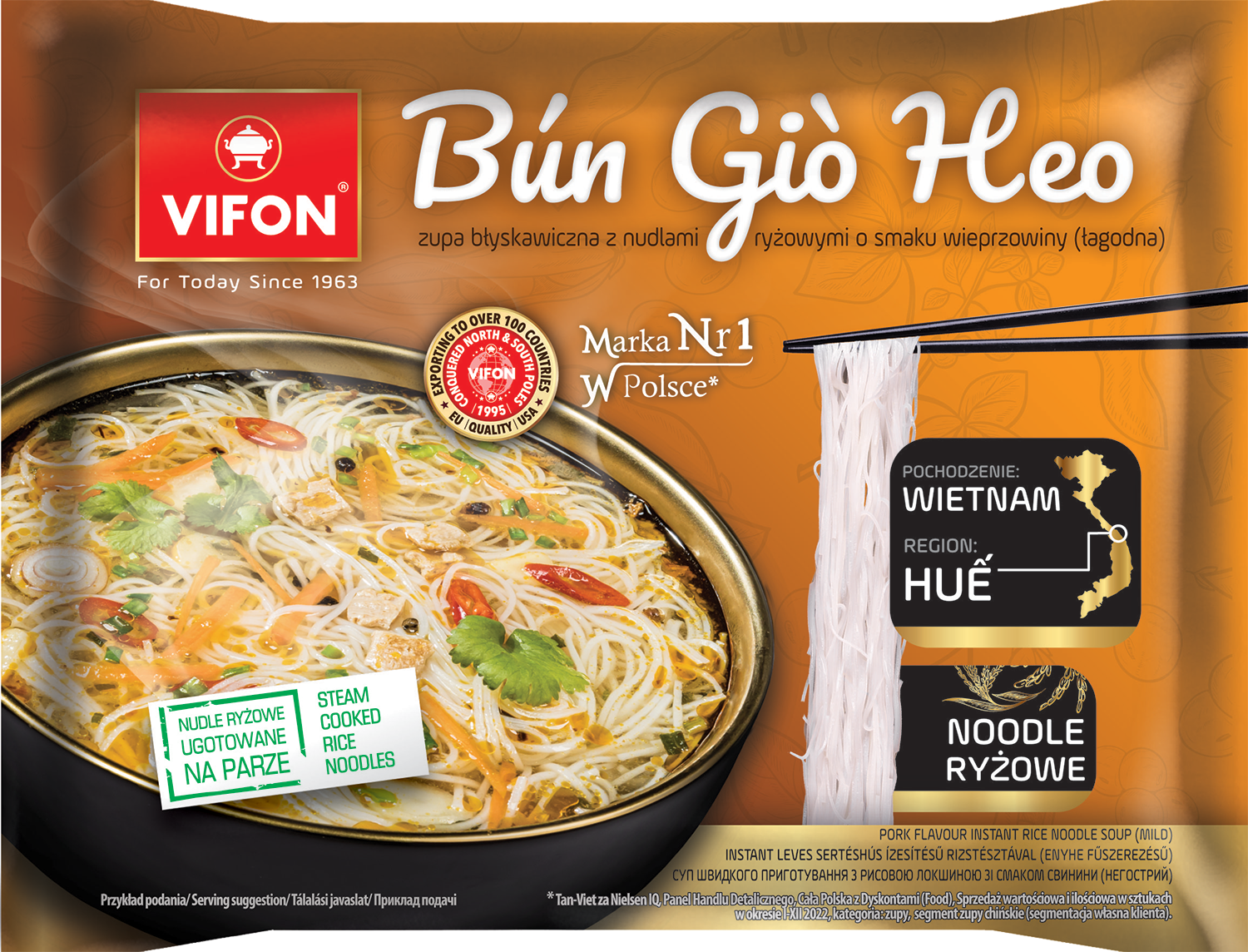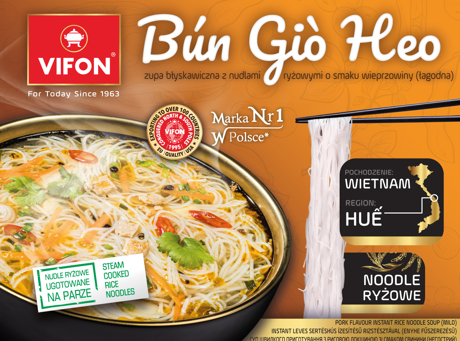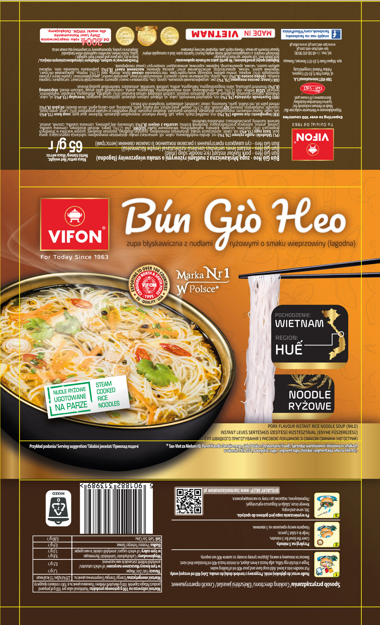 | Dodatkowe informacje na temat produktu | Zupa błyskawiczna z cienkimi nudlami ryżowymi o smaku wieprzowiny (łagodna) smaczna i sycąca, wywodzi się ze środkowego rejonu wietnamu hue. |