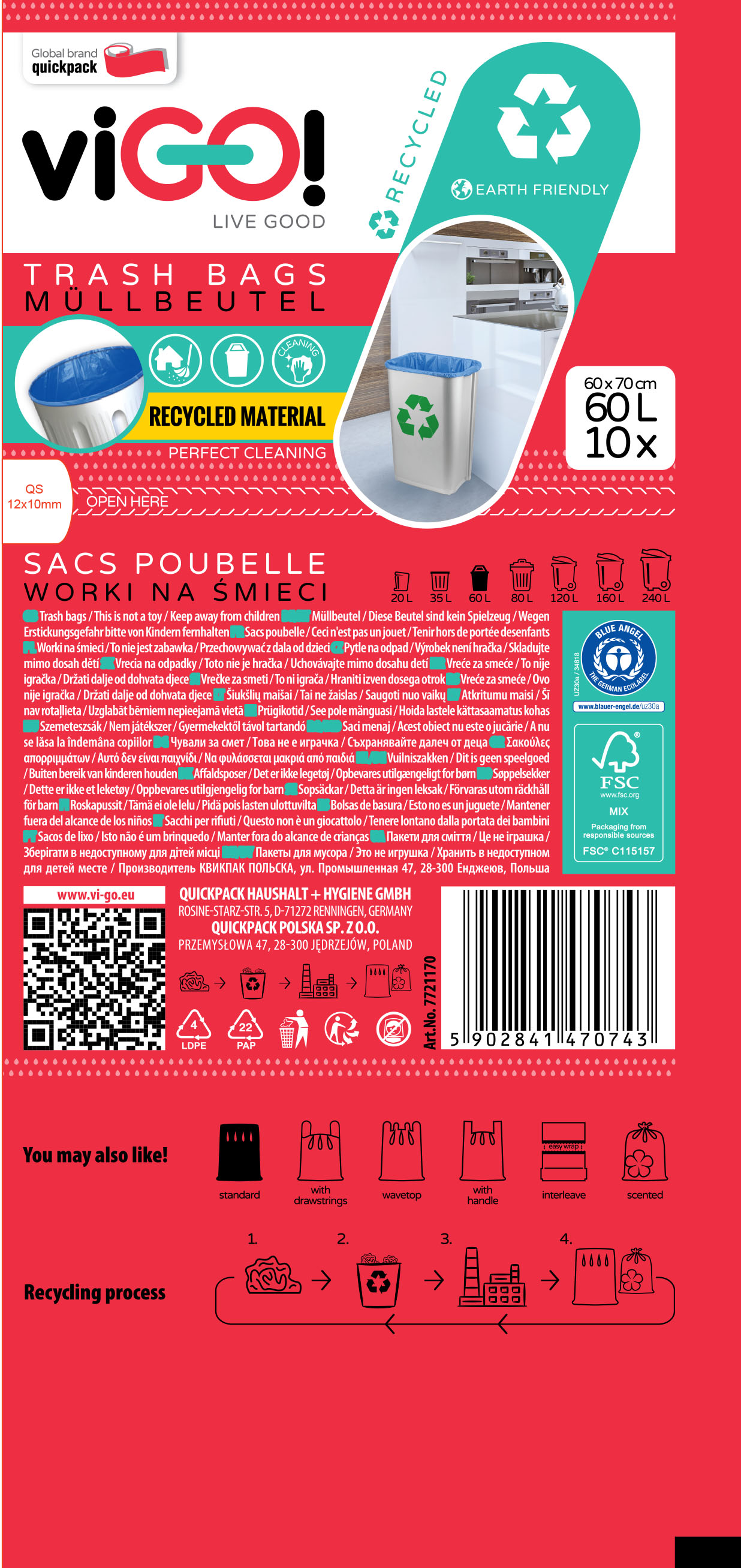 - viGO! Worki LD proste EKO do segregacji śmieci wykonane zostały w 100% z tworzywa pochodzącego z recyklingu. - Wszystkie worki z linii posiadają odpowiedni kolor folii zgodny z aktualnymi zasadami selektywnej zbiórki odpadów komunalnych: - worki w kolorze zielonym przeznaczone są zarówno do białego, jak i kolorowego szkła. - worki w kolorze niebieskim dedykowane są do papieru. - worki w kolorze brązowym przeznaczone są na odpady organiczne. - worki w kolorze żółtym służą do segregacji plastików i metali. - worki w kolorze czerwonym dedykowane są do odpadów medycznych.