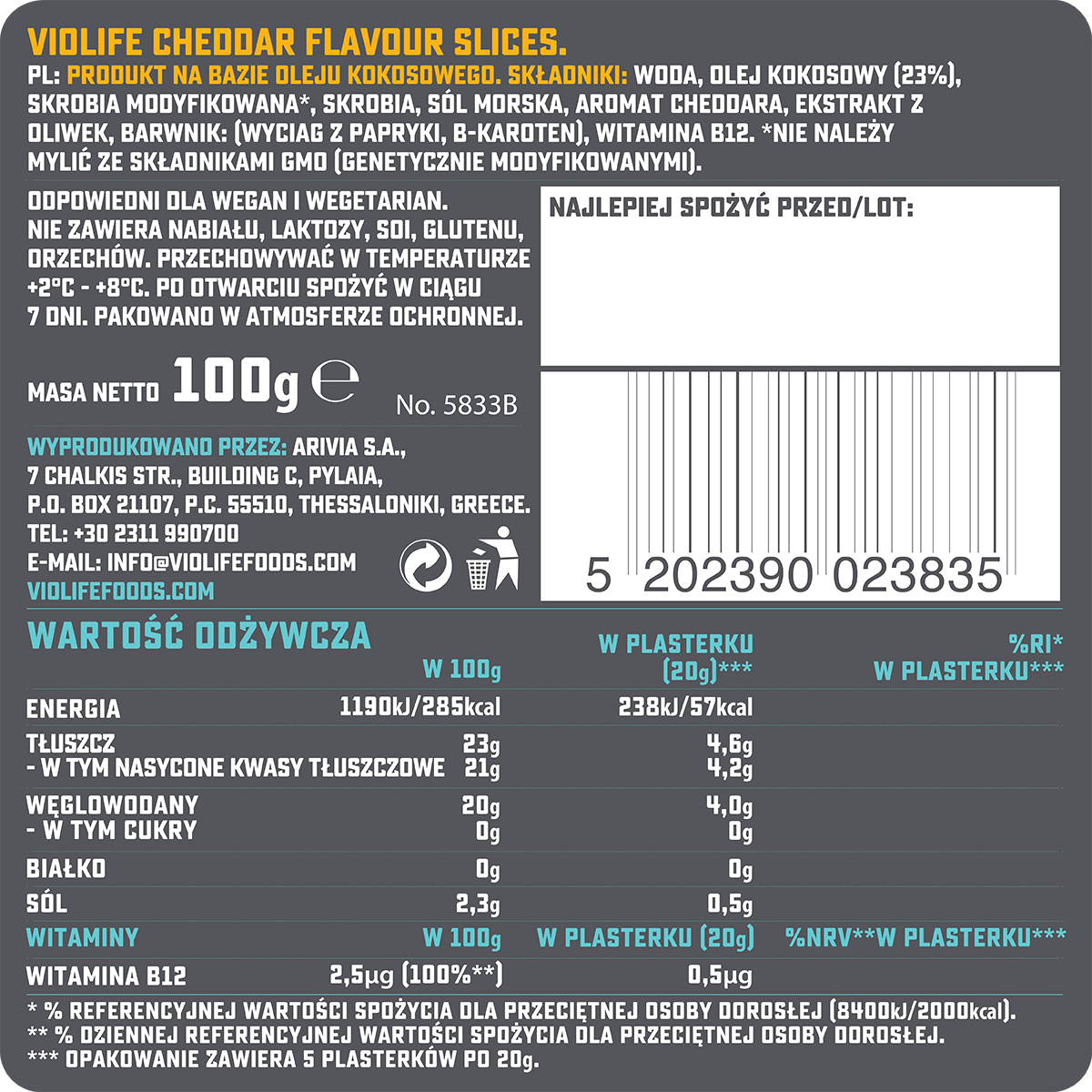 Krótki opis marketingowyRoślinna alternatywa dla sera cheddar w formie plastrów. 100% wegański. nie zawiera alergenów.