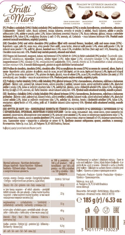 | Składniki | cukier, tłuszcz palmowy, miazga kakaowa, serwatka w proszku (z MLEKA), tłuszcz kakaowy, MLEKO w proszku odtłuszczone 3,4 %, MLEKO w proszku pełne 2,3 %, kakao o obniżonej zawartości tłuszczu 1,7 %, tłuszcz MLECZNY, glukoza, miazga z ORZECHÓW LASKOWYCH 0,9 %, kakao 0,5 %, emulgatory: lecytyny (z SOI) i E 476; aromaty, sól. Czekolada - masa kakaowa minimum 43 %. PRODUKT MOŻE ZAWIERAĆ ORZESZKI ARACHIDOWE, MIGDAŁY I PSZENICĘ. |