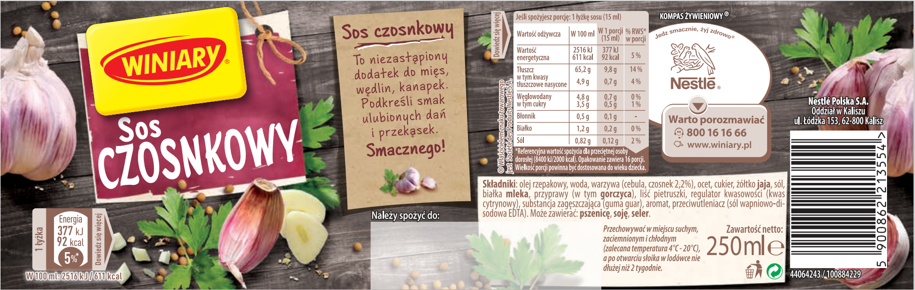 Winiary Sos Czosnkowy to kremowy, aromatyczny sos o wyrazistym smaku czosnku z wyczuwalnymi kawałkami. Bardzo dobrze sprawdzi się jako dodatek do pieczonych ziemniaków, grillowanych warzyw oraz mięs z rusztu. Warto wykorzystać go jako bazę do tworzenia ziołowych lub warzywnych dipów z czosnkową nutą. Skomponowany jest w oparciu o wysokiej jakości składniki, bez konserwantów. Winiary Sos Czosnkowy, to: - sos o wyrazistym smaku czosnku, wysokiej jakości składniki, bez konserwantów - idealny dodatek do potraw z grilla, sałatek i przekąsek - dostępny w szklanym opakowaniu 250ml oraz w plastikowej butelce 350 ml