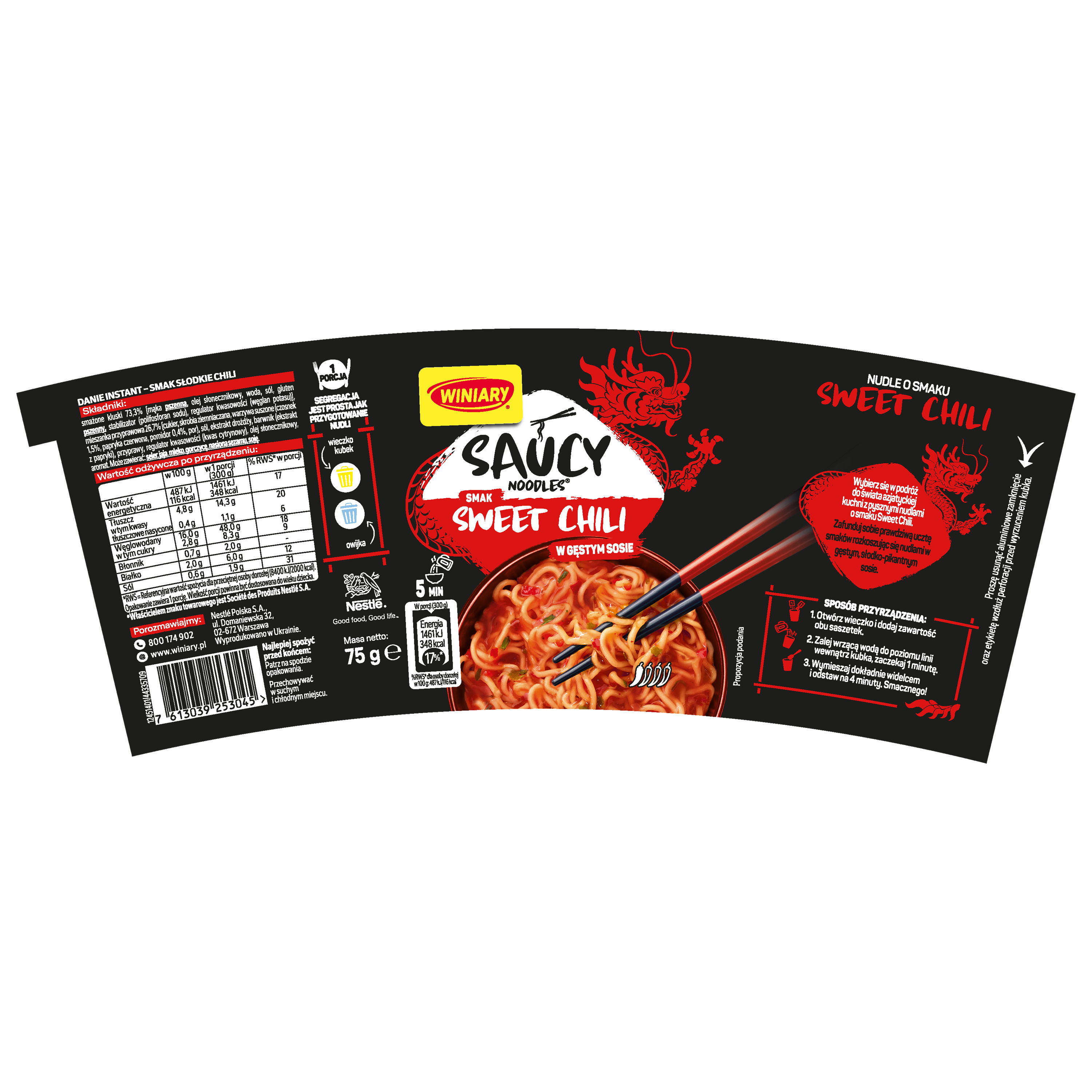 | Instrukcje dotyczące przygotowania | 1. otwórz wieczko i dodaj zawartość saszetek. 2. zalej wrzącą wodą do poziomu linii wewnątrz kubka, zaczekaj 1 minutę. 3. dokładnie wymieszaj i odstaw na 4 minuty. gotowe. |