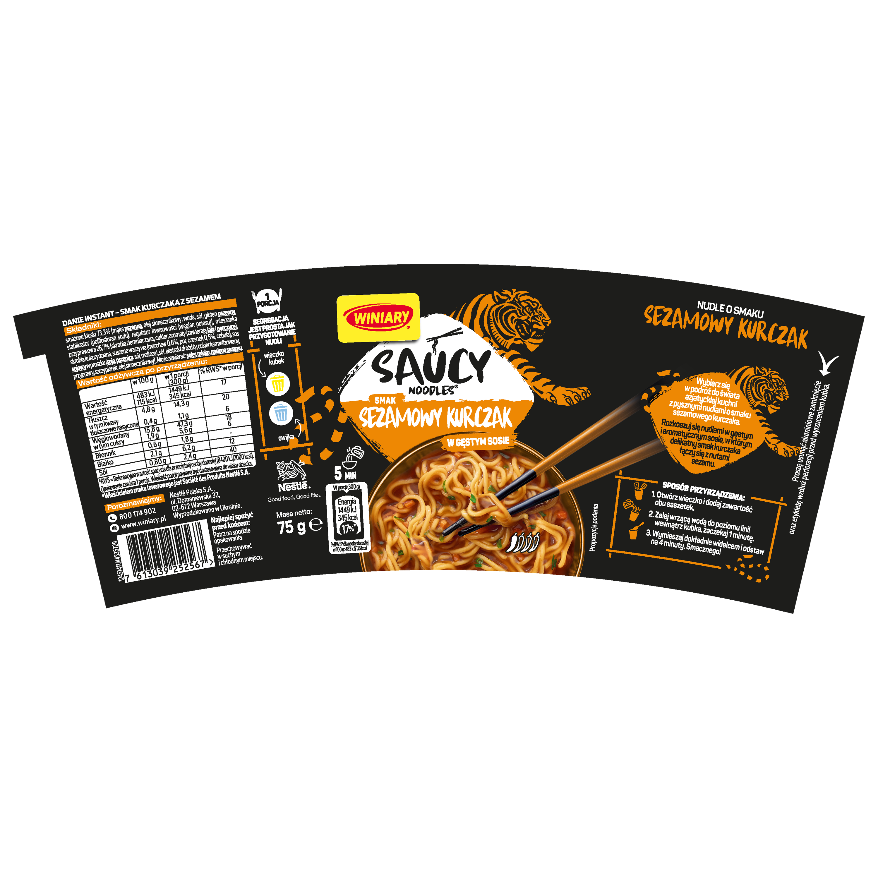 | Instrukcje dotyczące przygotowania | 1. otwórz wieczko i dodaj zawartość saszetek. 2. zalej wrzącą wodą do poziomu linii wewnątrz kubka, zaczekaj 1 minutę. 3. dokładnie wymieszaj i odstaw na 4 minuty. gotowe. |