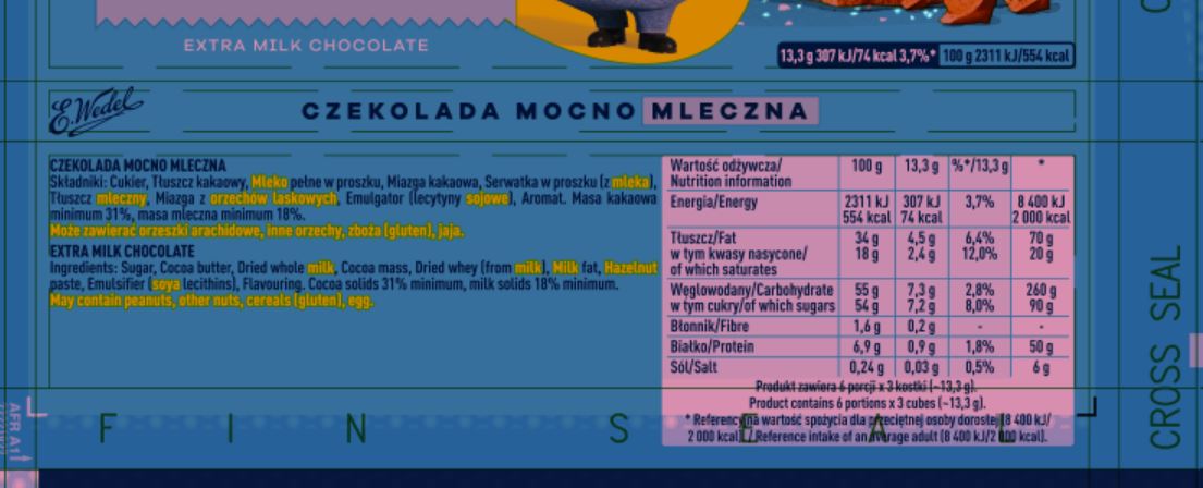 | Składniki | Cukier, Tłuszcz kakaowy, Mleko pełne w proszku, Miazga kakaowa, Serwatka w proszku (z mleka), Tłuszcz mleczny, Miazga z orzechów laskowych, Emulgator (lecytyny sojowe), Aromat. Masa kakaowa minimum 31%, masa mleczna minimum 18%. Produkt może zawierać orzeszki arachidowe, inne orzechy, zboża (gluten), jaja. |