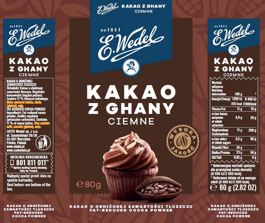 | Składniki | Kakao o obniżonej zawartości tłuszczu, Regulator kwasowości (węglan potasu). Zawiera 11% tłuszczu kakaowego. Może zawierać mleko, zboża (gluten), soję. |