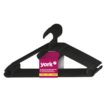 W opakowaniu zbiorczym: 3 KPL wieszaków w kolorze czarnym, 2 KPL wieszaków w kolorze białym, 1 KPL wieszaków kolorowych; zestaw 10 wieszaków obrotowych z uchwytami ułatwiającymi wieszanie spódnic i swetrów, obrotowy uchwyt ułatwia wieszanie ubrań w szafie i nie tylko; wykonany z wysokiej jakości tworzywa sztucznego; zastosowanie obrotowego uchwytu poprawia komfort użytkowania – umożliwia zawieszenie wieszaka pod każdym kątem; specjalna chropowata powierzchnia zapobiega ześlizgiwaniu się ubrań z wieszaka; wieszak został zaprojektowany z myślą o uzyskaniu zgrabnego kształtu przy zachowaniu parametrów wytrzymałościowych; do uniwersalnego użytku - wieszanie bluzek, spódnic, spodni, apaszek, krawatów.
