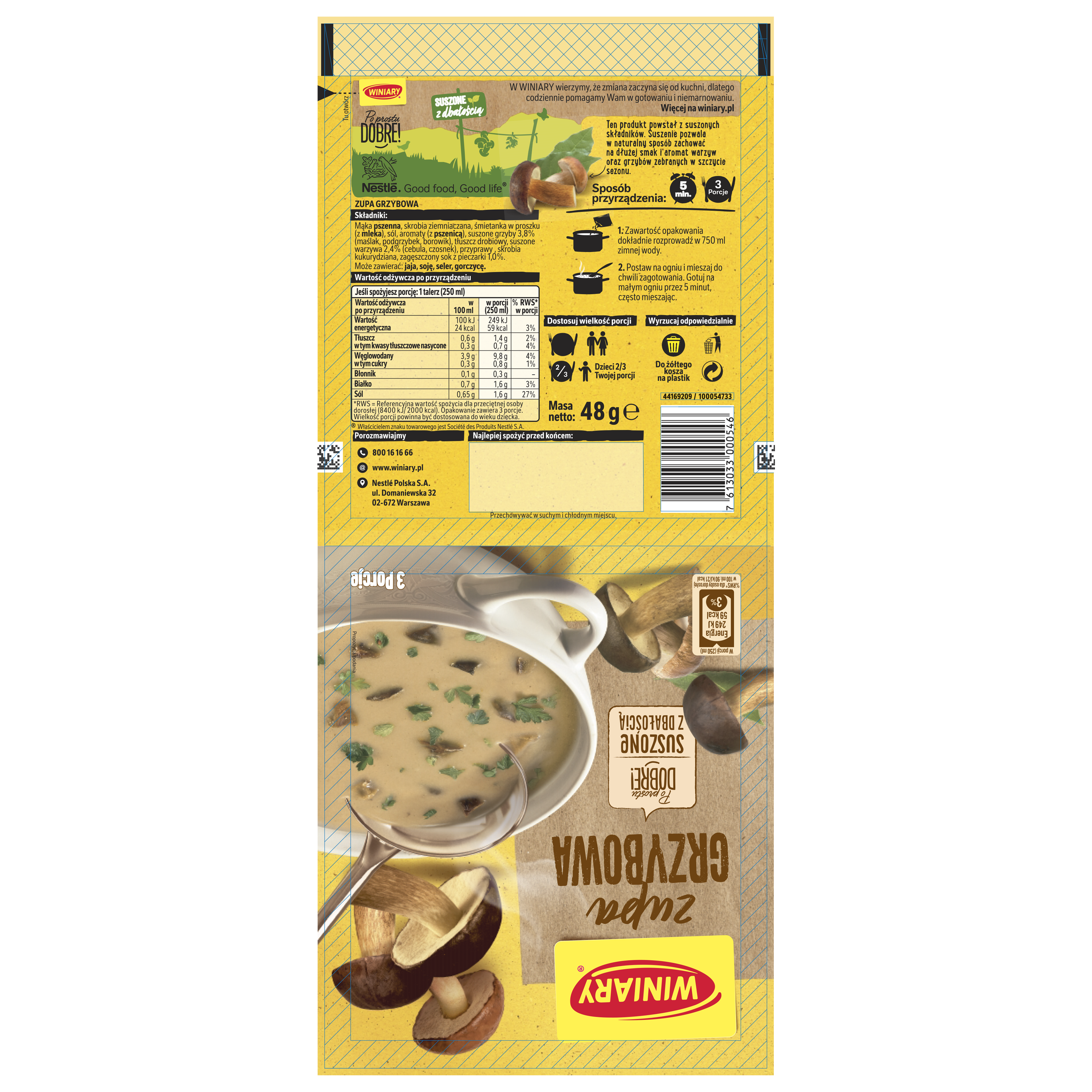 | Składniki | mąka pszenna, skrobia ziemniaczana, śmietanka w proszku (z mleka), sól, aromaty (z pszenicą), suszone grzyby 3,8% (maślak, podgrzybek, borowik), tłuszcz drobiowy, suszone warzywa 2,4% (cebula, czosnek), przyprawy, skrobia kukurydziana, zagęszczony sok z pieczarki 1,0%. Może zawierać: jaja, soję, seler, gorczycę. |