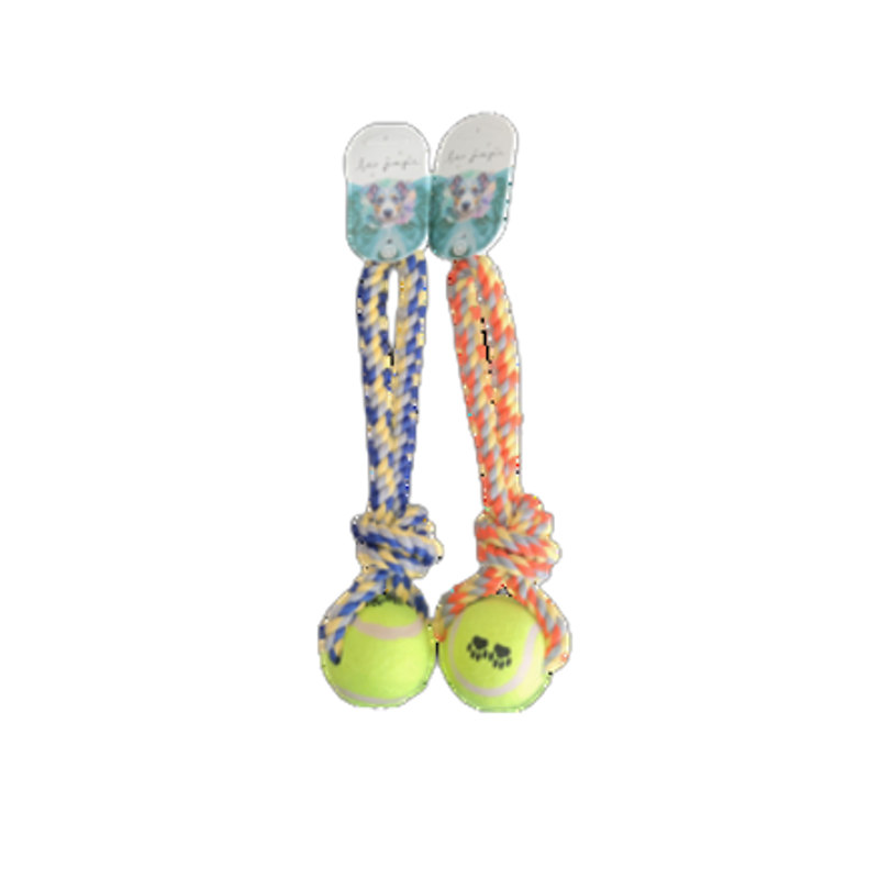 Zabawka dla psa, sznurek z piłką w kolorze biało- niebiesko - żółtym i biało - pomarańczowo-żółtym długości 38cm, poręczna, wygodna do rzucania pupilowi.