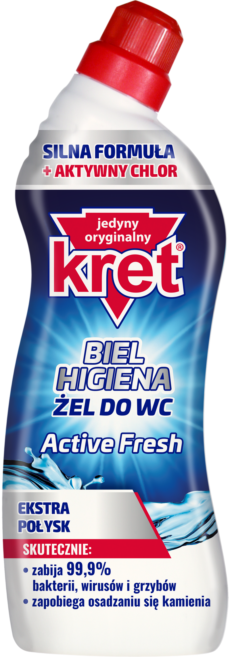 Kret Żel do WC BIEL HIGIENA Active Fresh – żel o działaniu bakteriobójczym, grzybobójczym oraz bójczym wobec wirusów osłonkowych – nr pozwolenia na obrót produktem biobójczym: 9375/23. Nowa receptura oparta na aktywnym chlorze i chloraminie zapewnia toalecie połysk, czyści i zapobiega osadzaniu się kamienia.