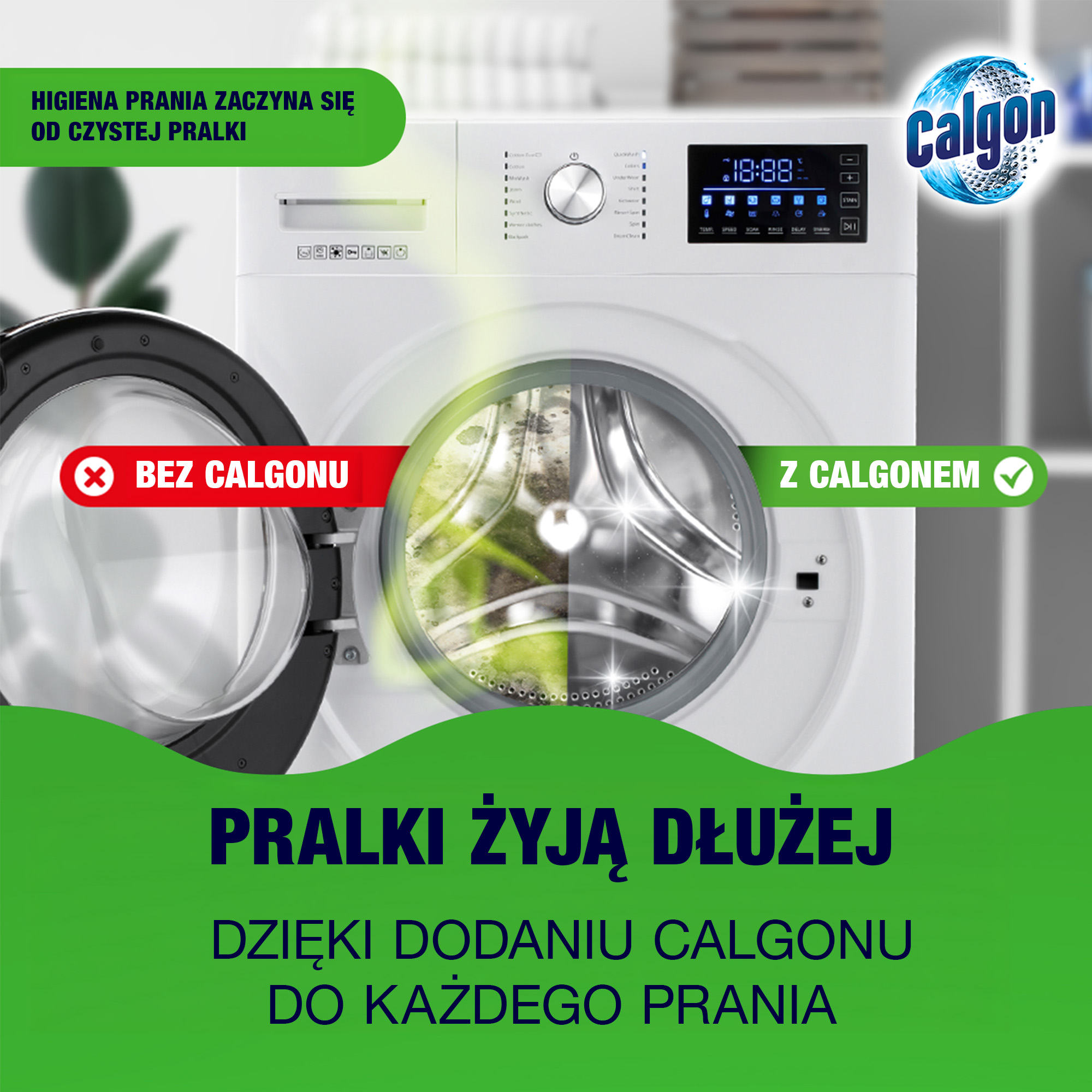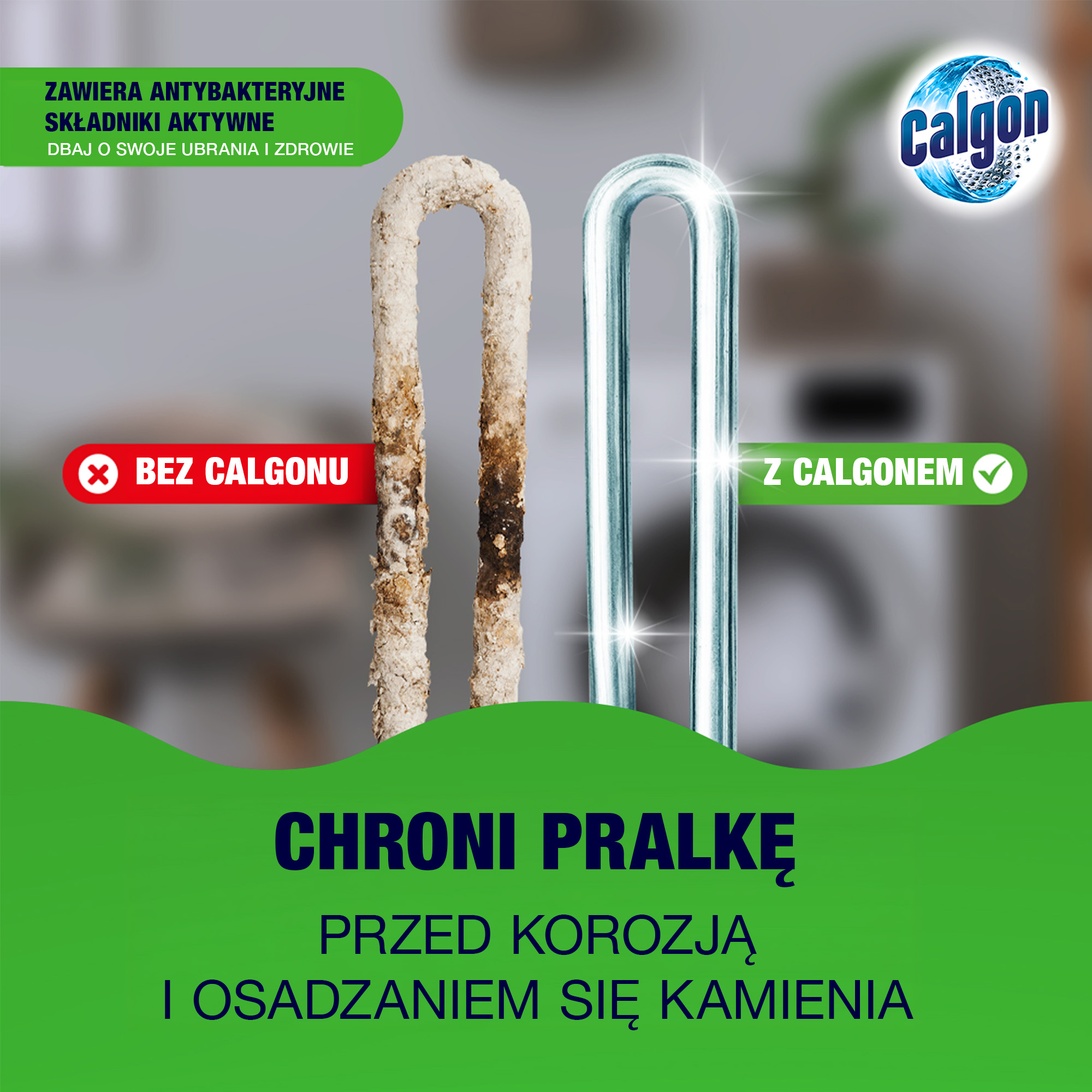 Nowy Calgon 2w1 ma podwójne działanie: Calgon neutralizuje twardą wodę, dzięki czemu zapobiega powstawaniu kamienia i chroni najważniejsze części pralki. Calgon zapewnia blisko 100% ochronę przed kamieniem. Calgon pomaga utrzymać w czystości pralkę. Chroni przed osadzaniem się brudu w postaci osadów z detergentów (ochrona przed osadami z mydła zawartego w środkach piorących). Dzięki zneutralizowaniu twardej wody Calgon ułatwia wypłukiwanie osadów z pralki pozostawiając ją olśniewająco czystą.