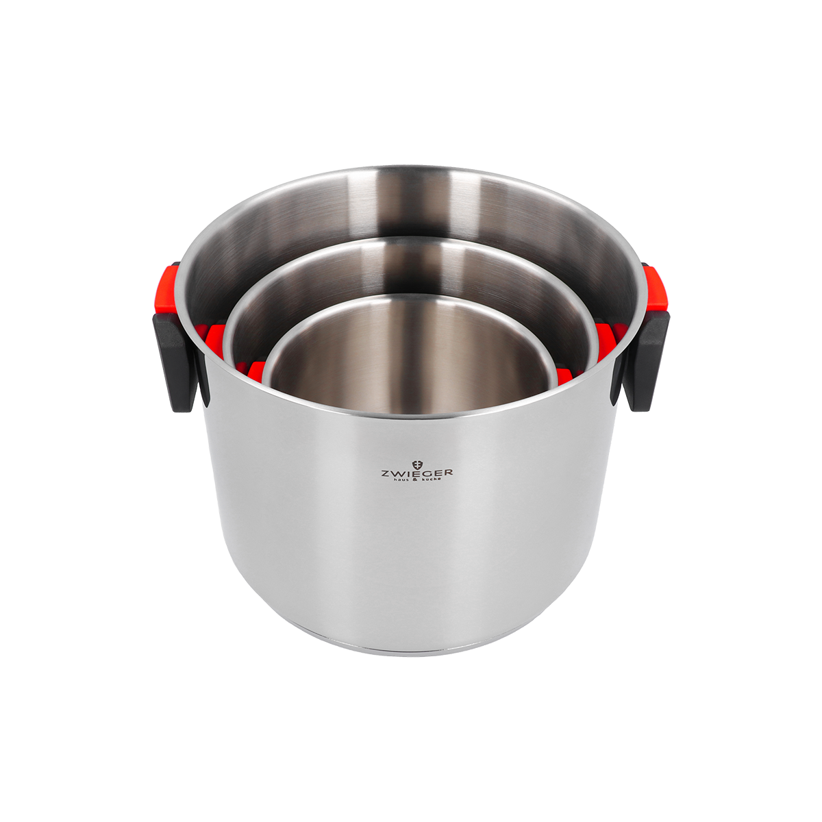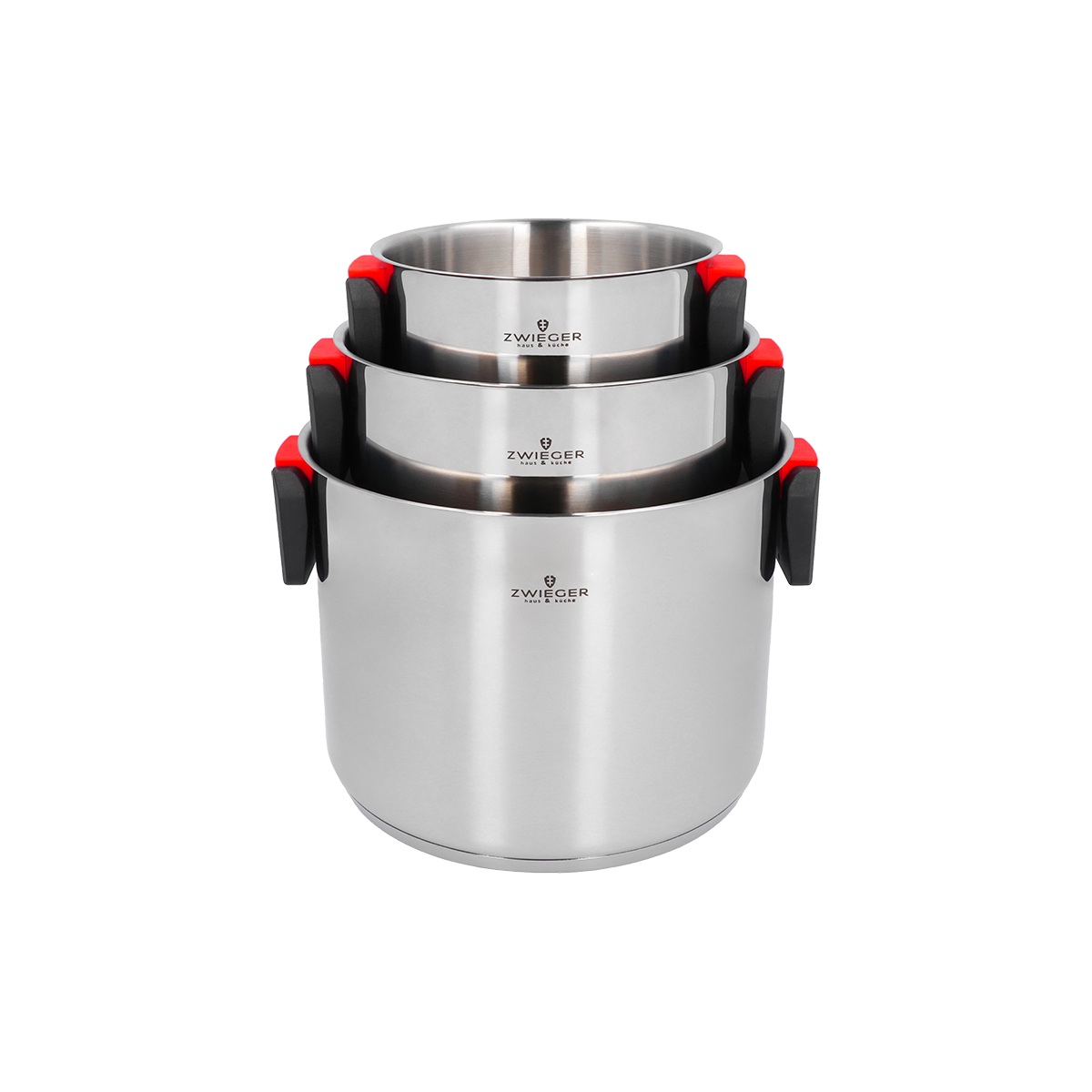 – Wyjątkowo masywna, najwyższej jakości stal nierdzewna – Powierzchnia zewnętrzna satynowana z polerowanym rantem – Masywne, nienagrzewające się uchwyty, wielopunktowo przytwierdzone do powierzchni garnka – Kwasoodporna stal – Wielowarstwowe dno typu „sandwich” (stal nierdzewna/aluminium/stal nierdzewna) łączy w sobie właściwości aluminium w zakresie rozprowadzania ciepła z trwałością i właściwościami magnetycznymi stali nierdzewnej – Dno formowane w technologii impact bonding zapewnia idealne łączenie warstw, gwarantując odporność na korozję i optymalne przewodzenie ciepła – Wszystkie pokrywki wykonane ze stali nierdzewnej o grubości 1 mm z otworami do uwalniania pary.