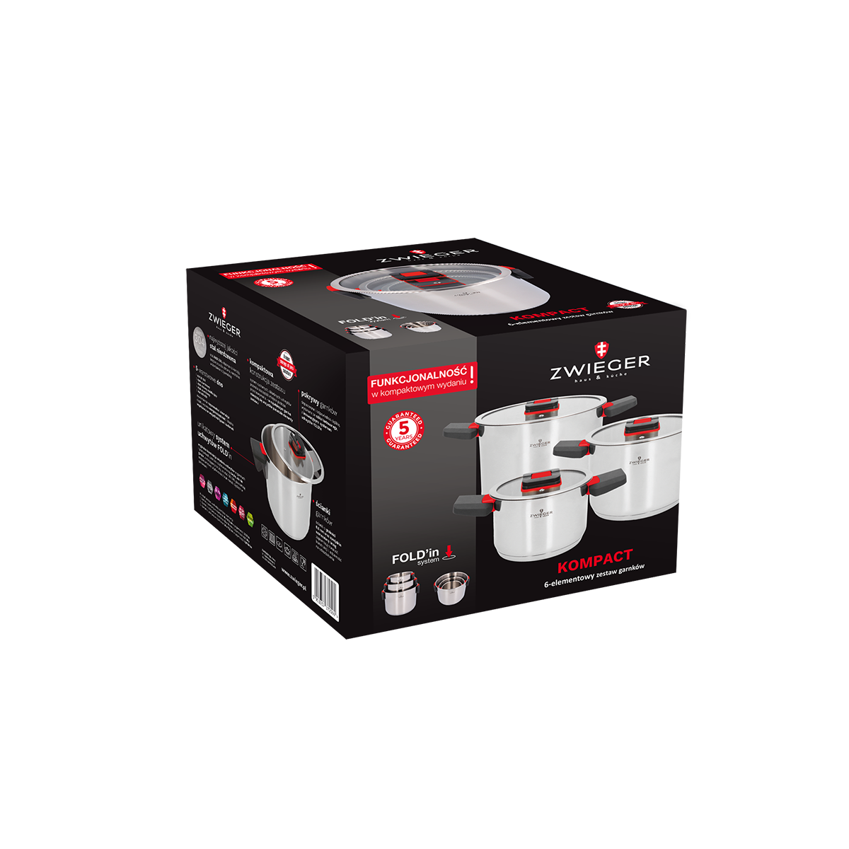 Garnki KOMPACT z systemem FOLD’in zostały wykonane z bardzo wysokiej jakości stali nierdzewnej o symbolu SS 304, czyli najlepszej stali wykorzystywanej do produkcji naczyń kuchennych. Materiał ten jest niezwykle odporny na korozję, a jego stosunkowa gładkość pozwala na szybkie i efektywne pozbycie się przypaleń i zabrudzeń. Garnki posiadają grube, pięciowarstwowe dno z dwoma aluminiowymi dyskami równomiernie rozprowadzającymi i akumulującymi ciepło, dzięki czemu idealnie współpracują z kuchenkami indukcyjnymi oraz zapewniają wysoką energooszczędność. Każde naczynie posiada dopasowane i odpowiednio ciężkie pokrywy wykonane ze szkła hartowanego, a także nowy system uchwytów FOLD’in. Jest to system, który wyróżnia się oryginalną konstrukcją składania umożliwiającą zaoszczędzenie miejsca podczas przechowywania – w największym garnku mieszczą się wszystkie pozostałe elementy zestawu. Zastosowane uchwyty podczas użytkowania są ciepłe, ale nie gorące, a śruby mocujące, wykonane również ze stali nierdzewnej SS 304, gwarantują, że powstające podczas gotowania skropliny nie będą zawierały żadnych metali ciężkich. Garnki posiadają ścianki o grubości 0,6 mm oraz specjalnie wzmocniony brzeg, które razem zapewniają trwałość konstrukcji i odporność na odkształcenia.