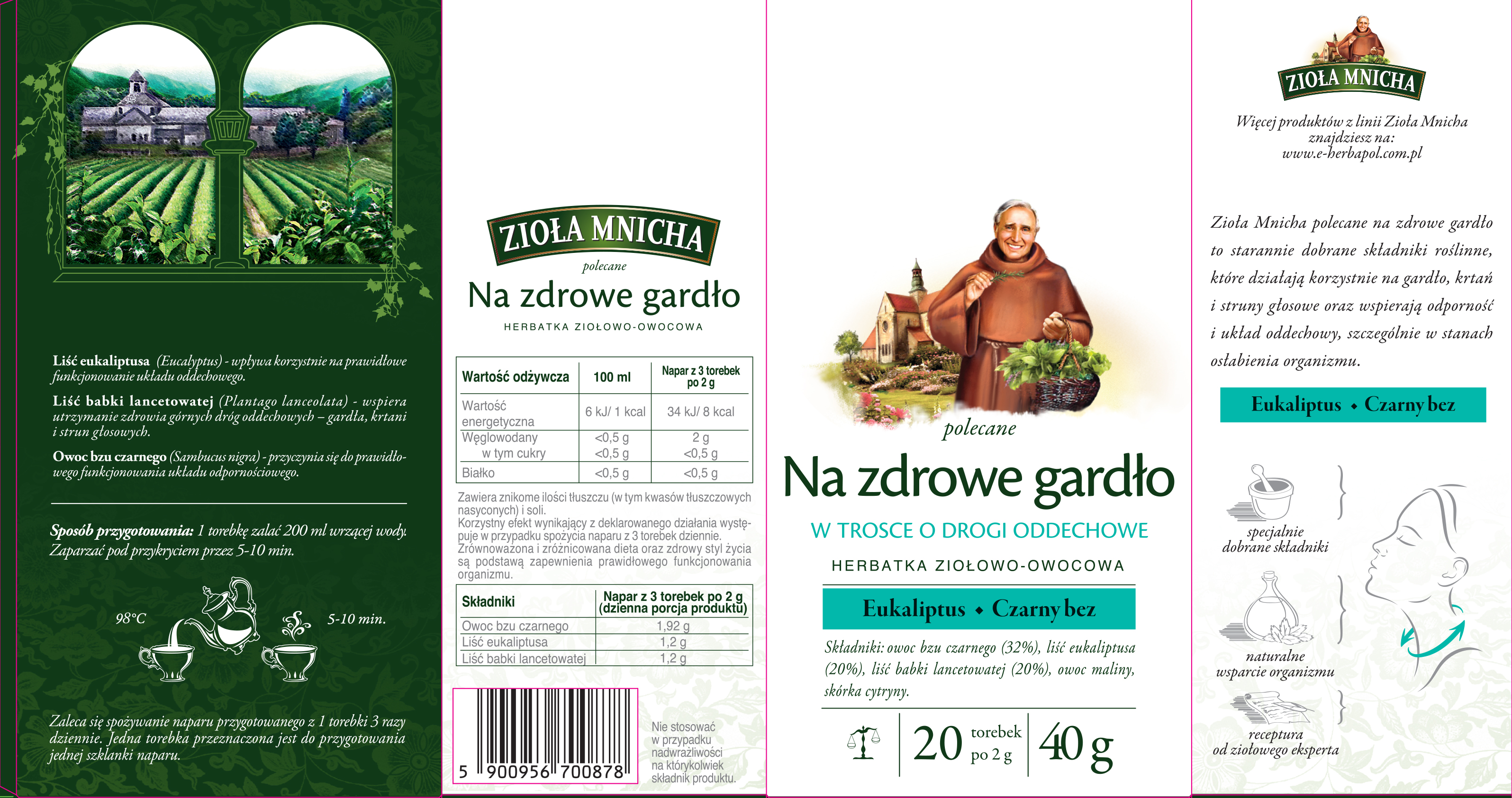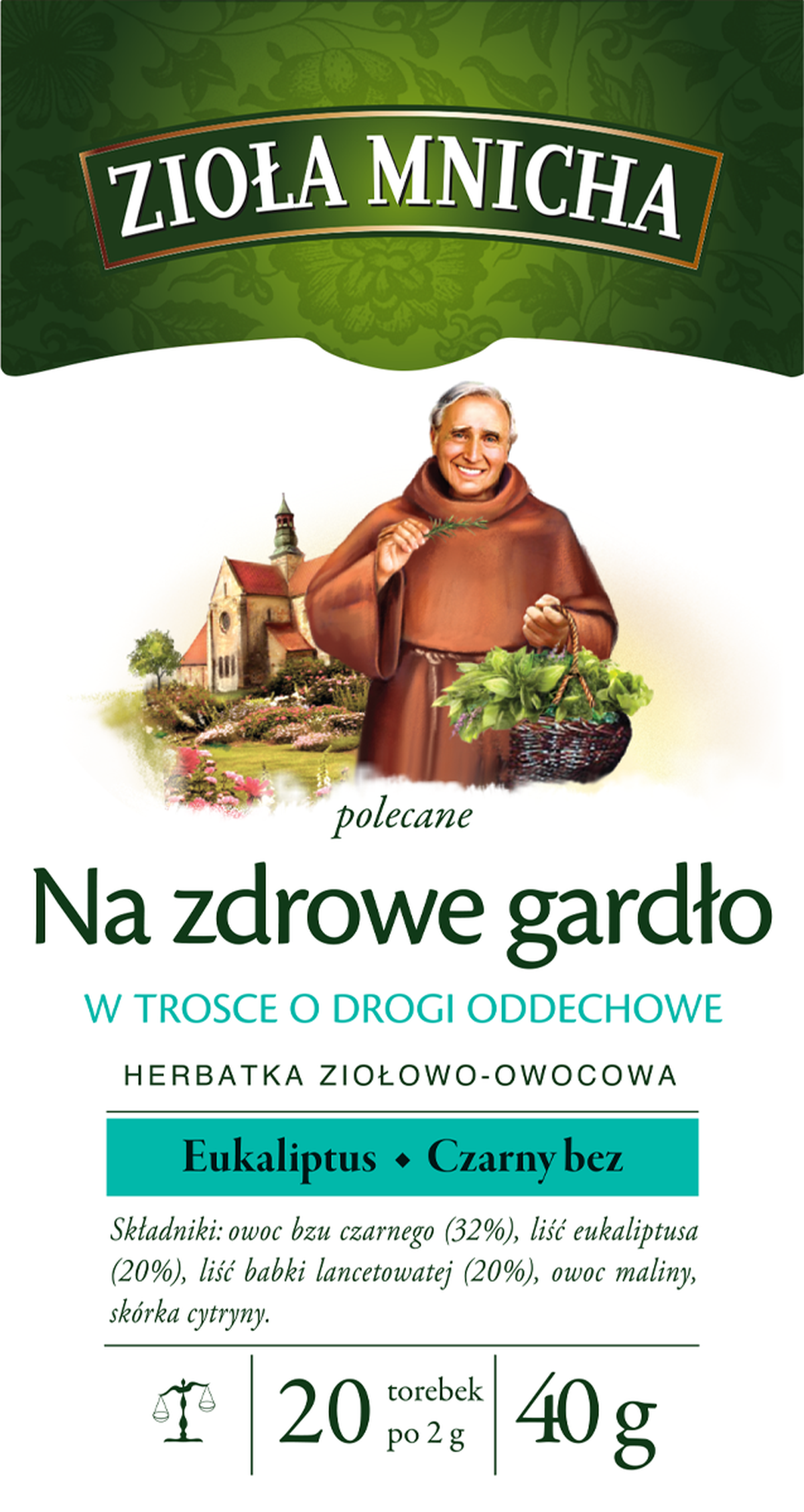 Zioła mnicha polecane na zdrowe gardło to starannie dobrane składniki roślinne, które działają korzystnie na gardło, krtań i struny głosowe oraz wspierają odporność i układ oddechowy, szczególnie w stanach osłabienia organizmu. Liść eukaliptusa (Eucalyptus) -wpływa korzystnie na prawidłowe funkcjonowanie układu oddechowego. Liść babki lancetowatej (Plantago lanceolata) -wspiera utrzymanie zdrowia górnych dróg oddechowych -gardła, krtani i strun głosowych. Owoc bzu czarnego (Sambucus nigra) -przyczynia się do prawidłowego funkcjonowania układu odpornościowego.