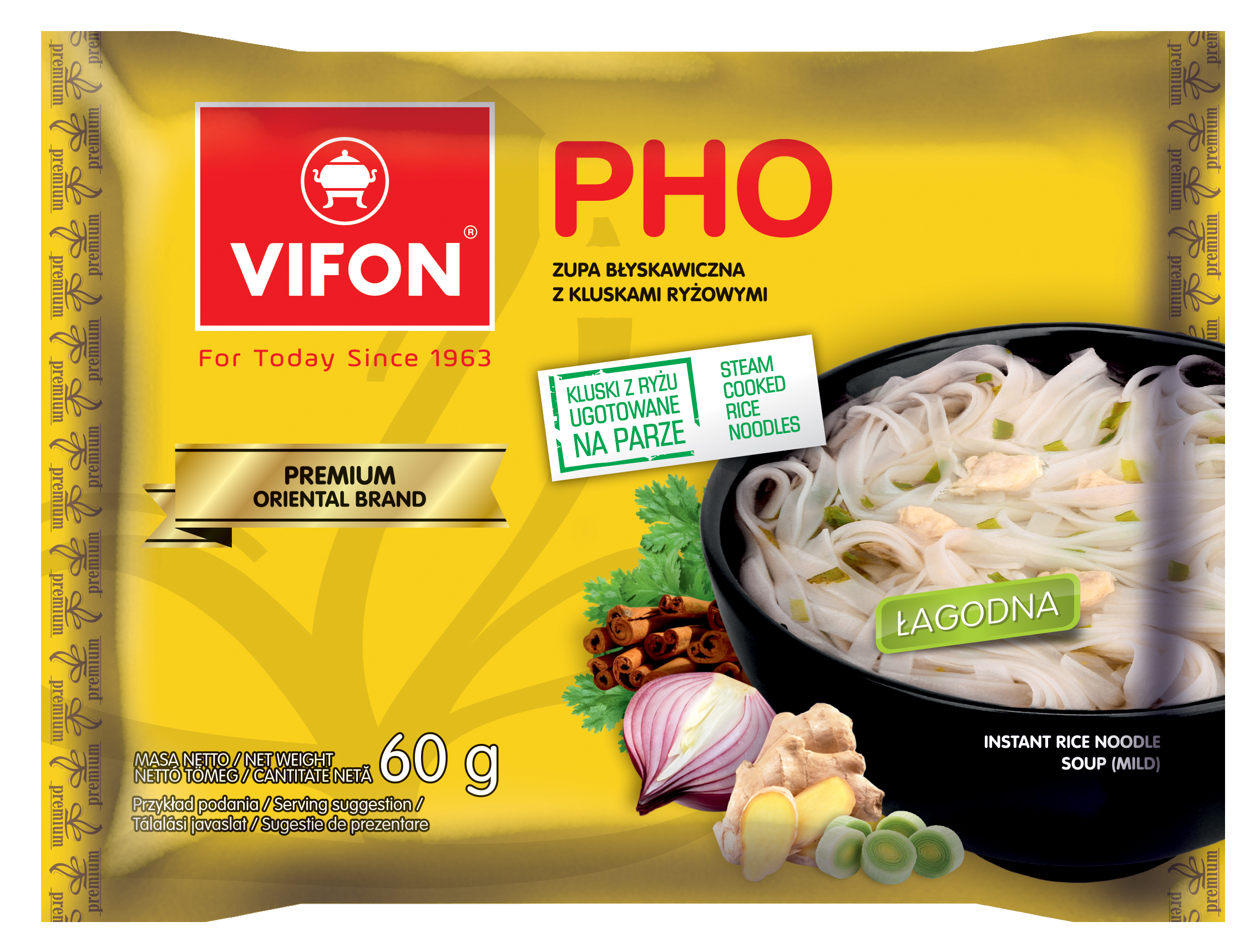 | Składniki | Składniki: kluski ryżowe (85%): ryż (90%), tapioka, cukier, sól, wzmacniacz smaku: glutaminian monosodowy, stabilizator: guma guar; dodatki smakowe (15%): sól, olej palmowy, cukier, wzmacniacze smaku: glutaminian monosodowy, guanylan disodowy, inozynian disodowy; teksturowany gluten pszenny (5%), czerwona szalotka (3%), suszony por (3%), aromat, przyprawa PHO w zmiennych proporcjach (1%): cynamon, goździki, anyż; imbir (1%), suszona kolendra (1%), chili, barwniki: karmel, karoteny; przeciwutleniacz: E 306. |