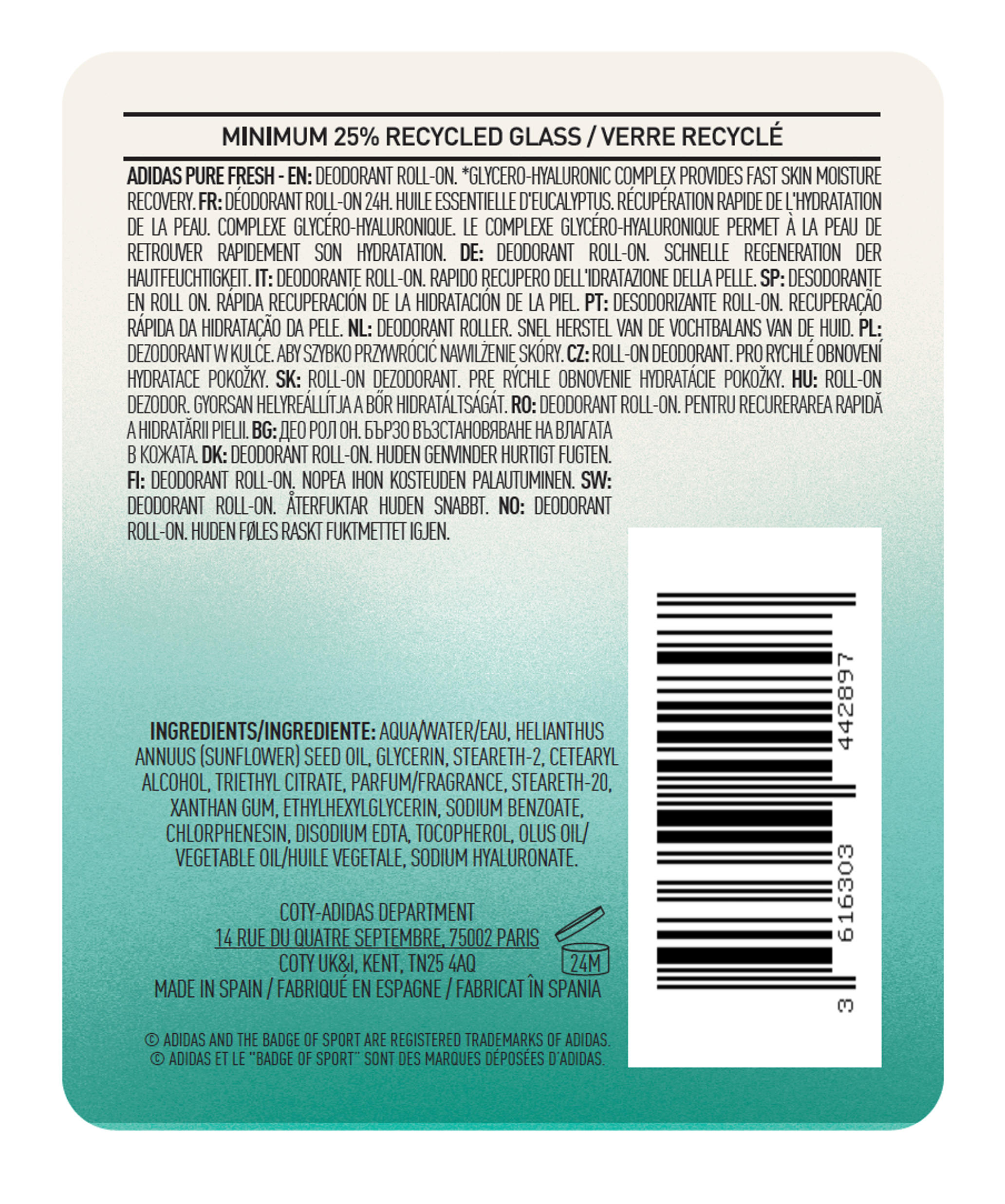 Daj z siebie wszystko podczas treningu dzięki nowej linii dezodorantów w kulce adidas active skin & mind. Innowacyjne formuły*, opracowane we współpracy z naukowcami zajmującymi się sportem, zostały stworzone, by zrewolucjonizować codzienną pielęgnację. Dezodorant w kulce active skin & mind energy kick z mandarynkowym olejkiem eterycznym zapewnia 24-godzinną ochronę przed nieprzyjemnym zapachem, a dzięki kompleksowi glicerolu i kwasu hialuronowego pozwala błyskawicznie przywrócić odpowiedni poziom nawilżenia skóry. Formuła nie zawiera alkoholu ani aluminium. Kosmetyk może być stosowany pod pachami, na szyi, na nadgarstkach i na klatce piersiowej. Dezodorant w kulce – stworzony z myślą o miłośnikach sportu – ma czystą, wegańską formułę i został przetestowany pod kontrolą dermatologiczną. Troszczymy się o naszą planetę – opakowanie zostało wykonane w co najmniej 25% ze szkła z recyklingu, a nakrętka – w 68% z plastiku z recyklingu. * formuły pozwalające na błyskawiczne przywrócenie odpowiedniego poziomu nawilżenia skóry dezodorant w kulce z mandarynkowym olejkiem eterycznym zapewniający 24-godzinną ochronę przed nieprzyjemnym zapachem kompleks glicerolu i kwasu hialuronowego pozwalający na błyskawiczne nawilżenie skóry* formuła niezawierająca alkoholu ani aluminium kosmetyk nadający się do stosowania pod pachami, na szyi, na nadgarstkach i na klatce piersiowej czysta, wegańska formuła testowana pod kontrolą dermatologiczną opakowanie wykonane w co najmniej 25% ze szkła z recyklingu, a nakrętka – w 68% z plastiku z recyklingu * błyskawiczne przywrócenie odpowiedniego poziomu nawilżenia skóry