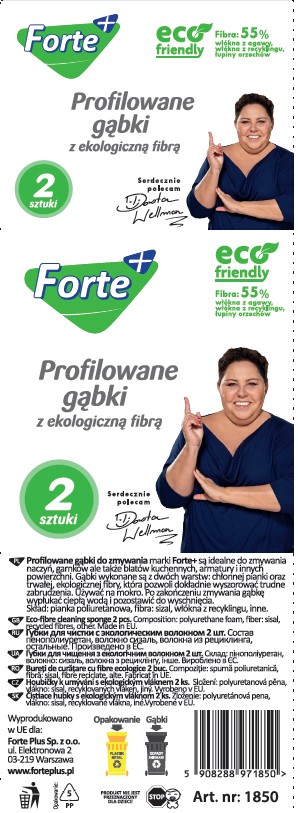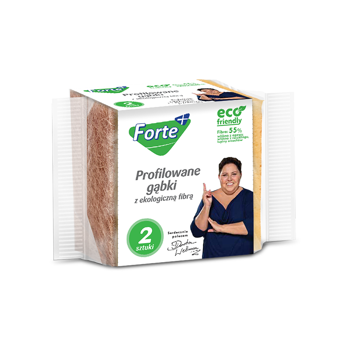 Gąbki do zmywania marki Forte+ są idealne do zmywania naczyń, garnków, ale także blatów kuchennych, armatury i innych powierzchni. Gąbki wykonane z dwóch warstw: chłonnej pianki, oraz trwałej, ekologicznej fibry, która pozwoli dokładnie wyszorować trudne zabrudzenia.