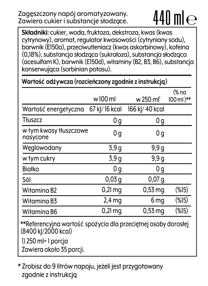 | Składniki | cukier, woda, fruktoza, dekstroza, kwas (kwas cytrynowy), aromat, regulator kwasowości (cytryniany sodu), barwnik (E150a), przeciwutleniacz (kwas askorbinowy), kofeina (0,18%), substancja słodząca (suklaroza), substancja słodząca (acesulfam K), barwnik (E150d), witaminy (B2, B3, B6), substancja konserwująca (sorbinian potasu). |